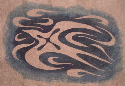 旗を作るというワークショップで制作した型を発展させ、手元にあったもっとも大きな和紙で制作したもの。使った和紙は鳥取県佐治の和紙をそのままの大きさ。全紙大ほど。
