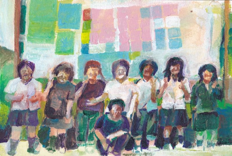高校時代の文化祭の案内図を作ったときの写真を描いたものです。後ろにあるのが模造紙で作った校舎案内の看板です。ちょうど今ぐらいの時期です、文化祭の準備をしている期間の、あの夏の雰囲気と、なんともいえない自由さと爽やかさを思い出すと、こころにぎゅんときて切なくなります。みんな元気にしているか心配です。