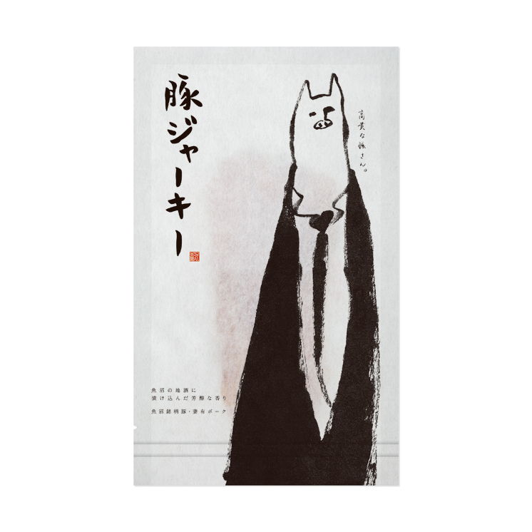 豚ジャーキーの様々な面で優れた高級豚肉でありながらも、お酒の場を賑やかにする“おつまみ”でもあるという点から、品・格調の高さがありながらも、親しみやすさ・ユニークさを合わせ持つ、「高貴な豚さん。」というキャラクターをつくりました。商品名とキャラクターをパッケージに大きくのせ、認知と印象づけを機能させたデザインを表現いたしました。