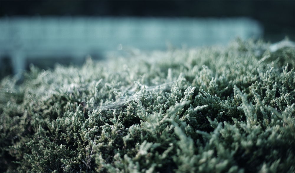 カイズカイブキ上の蜘蛛の巣 http://www.fphoto.info/SY-040.html