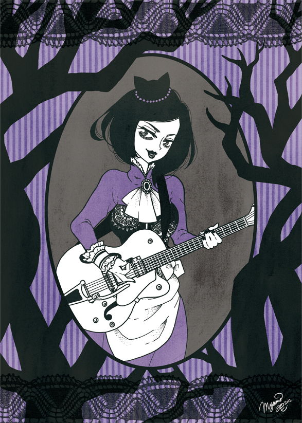 使用画材:Photoshop、ミリペン/スタイル:Myamo's Style/溜池山王にて開催した『3かい ちょこっと おしてみる〜3つのリトルプレス展〜』にて展示したイラストです。ギターはグレッチ。