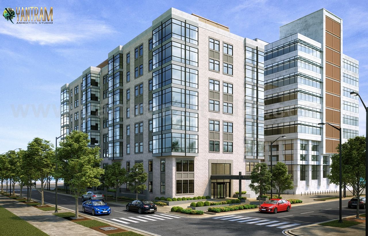 3D Exterior Design Companies of A Modern Residential Building design, Stunning Road Side Residential Apartment with species Greenery, The Building looks Very Clean and Modern with large Space, amazing View and Thus Fantastic Atmosphere. Design Includes Enough Parking Space, walking area and More Beautifully Internal Units Developed by Yantram Architectural Rendering Companies, Dubai - UAE