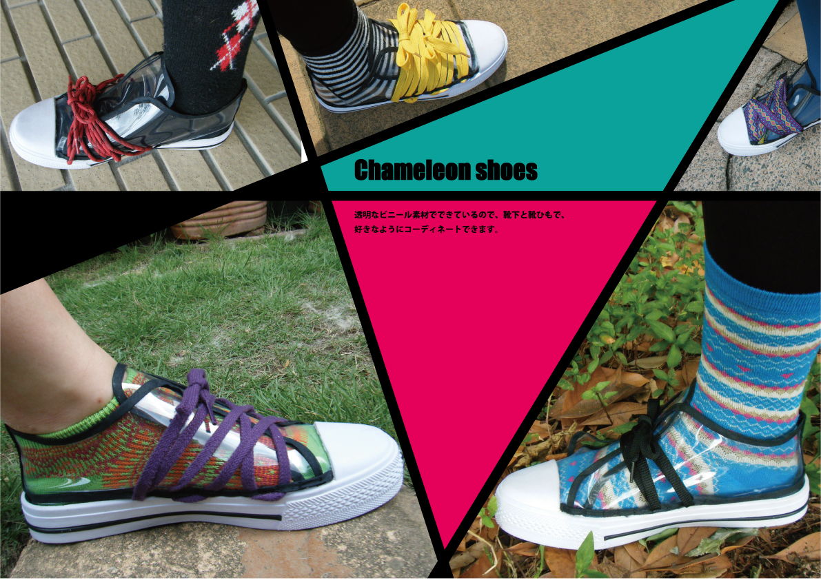 靴ひもと靴下の組み合わせを楽しむビニール地でできた靴。