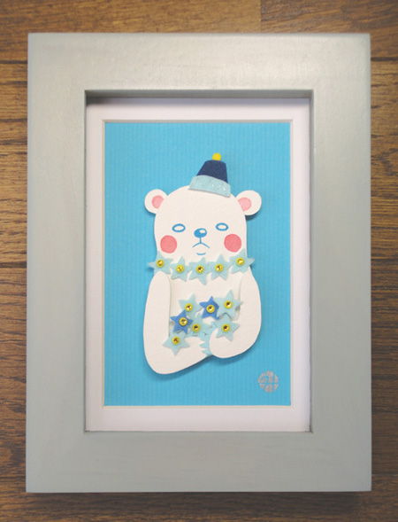 花と動物を描きました。透明水彩とフェルトとラインストーン類で制作。半立体の作品です。
