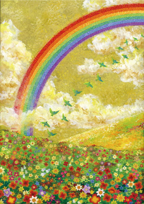 大きな虹と、青い鳥がたくさん羽ばたく様子を描くことで、