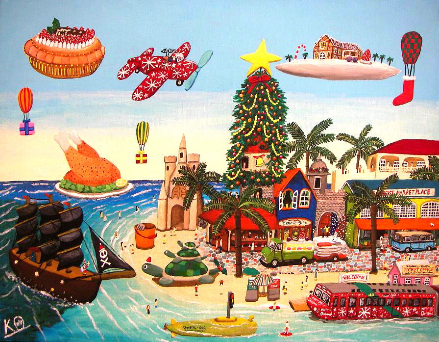 P10サイズ(530×410)のキャンバスにアクリル絵の具で描いた物で、12月の17日より開催される「経堂駅前グループ展 in 素々「冬」2012-2013」に展示するイラスト。 今年(2枚目)のクリスマスイラストですが例年とは趣向を変えて夏(南半球)のクリスマスの絵となりました。