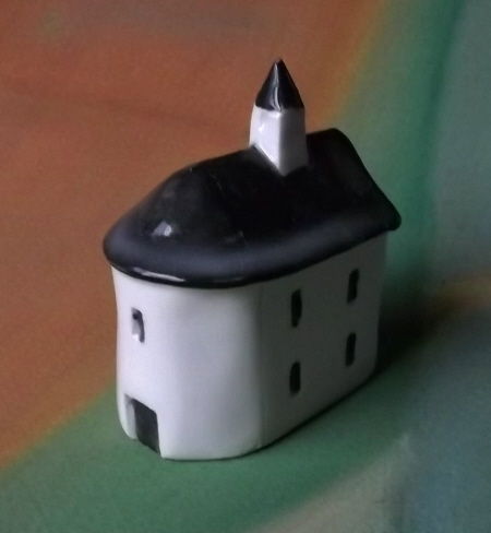 白壁に黒い屋根。玄関側の壁が優雅に弧を描く、ヨーロッパの住宅をモデルに作った陶器のミニチュアハウスです。