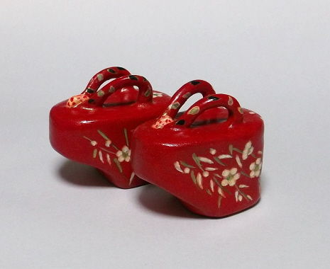 下駄の置物は一種の縁起物で「足腰が元気」「来客が絶えない」という意味があり、玄関やお手洗いなどに飾ると良いそうです。飾って華やかな、舞妓さんのポックリを陶器で作ってみました。
