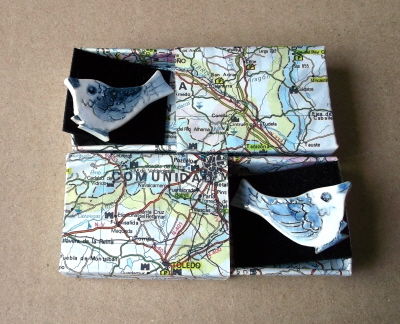 呉須だけで着彩した、白と青のシンプルなデザイン。紙製の小箱も手作りで、スペインの地図を貼りました。
