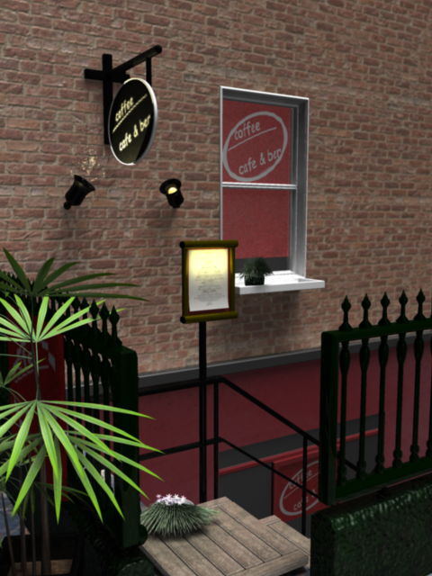 室内の作品が多かったので野外の風景の作品を制作しようと思い、昼間はカフェ夜はバーのお店をイメージして製作しました。細かい所ですが、シンプルですがロゴ等も考えデザインしています。