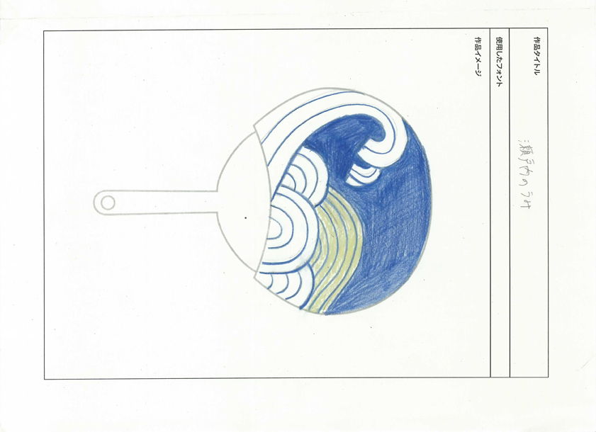 うどんをイメージした模様で瀬戸内の海とさぬき富士をデザインしました。色合いは全体的のイメージの海の青を基調とし、さぬき富士を悪戦とに黄~クリーム色で配色しました。
