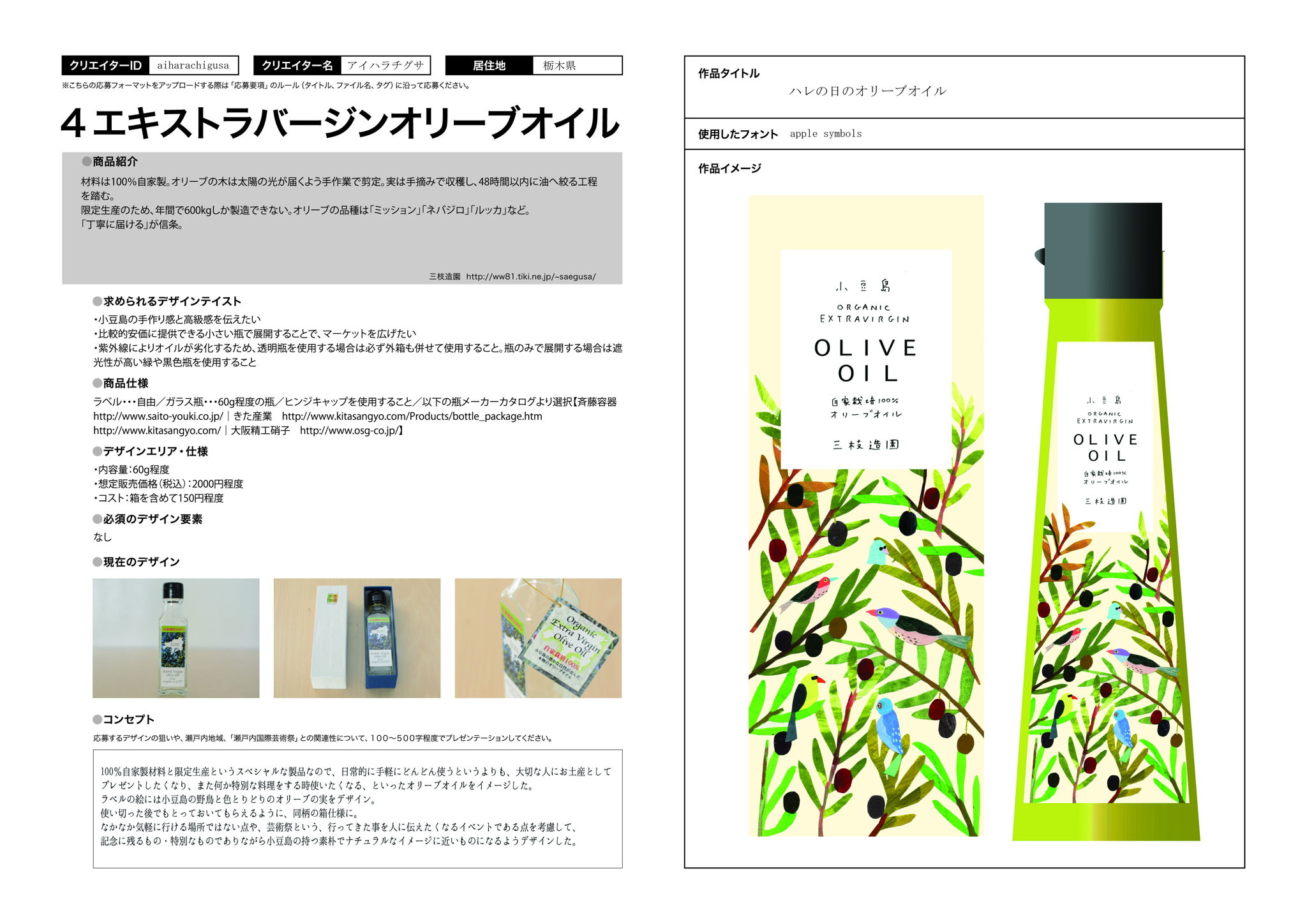 100%自家製材料と限定生産というスペシャルな製品なので、日常的に手軽にどんどん使うというよりも、大切な人にお土産としてプレゼントしたくなり、また何か特別な料理をする時使いたくなる、といったオリーブオイルをイメージした。ラベルの絵には小豆島の野鳥と色とりどりのオリーブの実をデザイン。使い切った後でもとっておいてもらえるように同柄の箱仕様に。なかなか気軽に行ける場所ではない点や、芸術祭という、行ってきた事を人に伝えたくなるイベントである点を考慮して、記念に残るもの・特別なものでありながら小豆島の持つ素朴でナチュラルなイメージに近いものになるようデザインした。