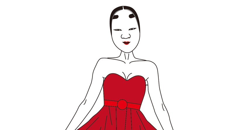 日本の伝統芸能である能で使用されるお面の1つである小面を、ドレス姿と合わせることで違和感やおもしろさを表現しました。