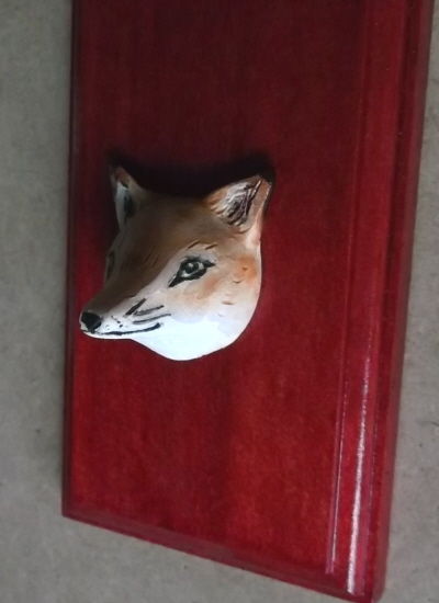 キタキツネのマスクを陶器で作り、縁のついた木の台に貼ったものです。