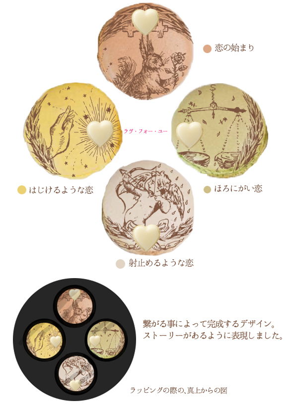 黄色いマカロンには太陽のような表現と、それを眩しくみせるような「はじけるような恋」。