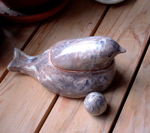 赤と白と黒の土をマーブル模様になるように練り込み、鳥の形に成形して中をくり抜きました。