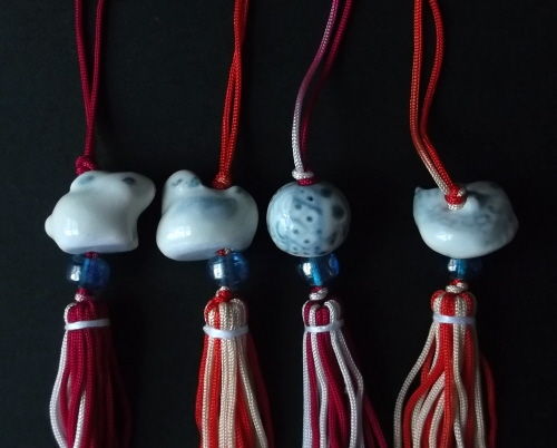呉須で着彩した焼いた陶器のビーズに、ガラスビーズとグラデーションの紐を使って根付に仕立てました。