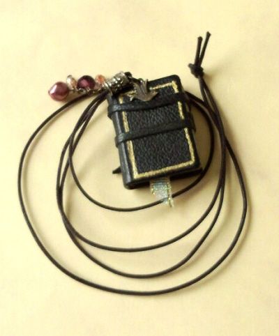 黒い牛革で装幀した豆ノートをネックレスに仕立てました。ちゃんと書き込みも出来る丸背ハードカバーです。