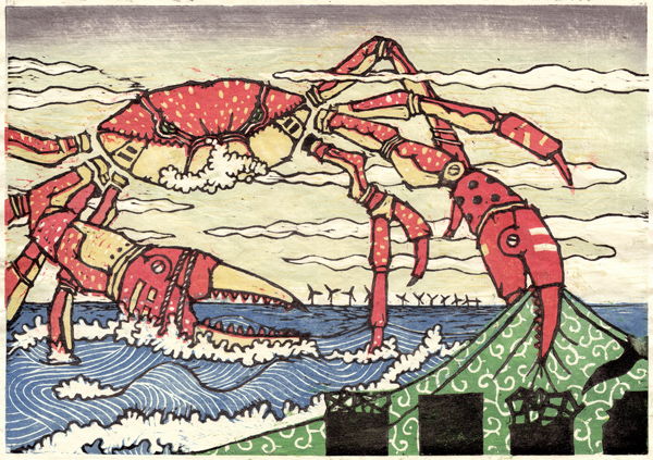 2011年 木版画 脱原発を訴えるために制作。6版を使っての作品。浮世絵のような雰囲気にしたかったのですが、なかなか難しいです。