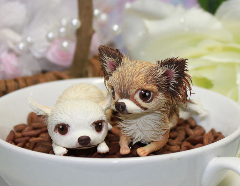 コーヒーショップの看板犬なのでコーヒーカップの上に仲良く並んでいます。