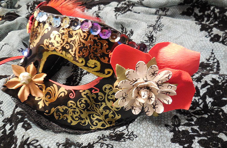 「中2病」をテーマに、黒い仮面に薔薇とか羽とか金の模様を散らしてみました。前回にひきつづき、今回も100均で手作りしたものです〜。