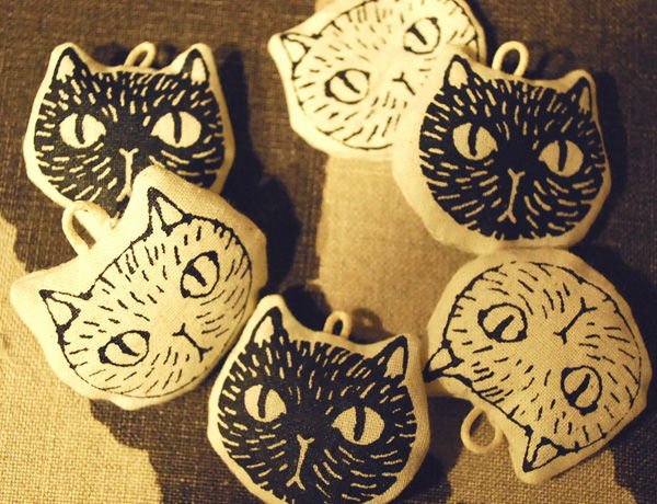 手芸。Tシャツくんでプリントした猫を、表は白、裏は黒で縫い合わせています。