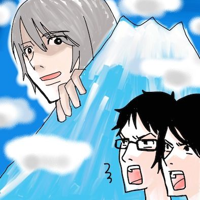 左に髭の斉藤祐樹×右にフジファブリックの山内総一郎+背景:富士山の山頂で志村正彦が羨ましソウに見ているというリクエストをいただき描きました。結果として進撃の志村になりました。