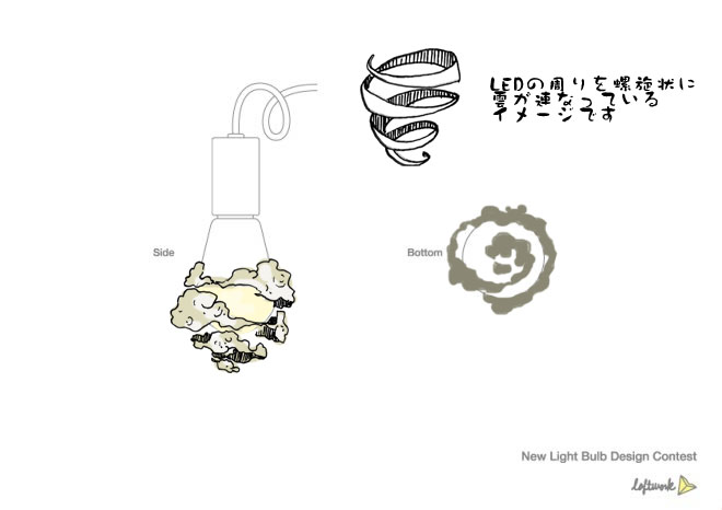 太陽に濃い雲がかかっているイメージでLEDの周りに螺旋状に連なった雲が取り巻いているカバーです。カバーの素材や色、LEDのカラーによっては惑星とその表面の雲。あるいは恒星とその表面に渦巻くガスのようにも見えるかもしれません。雲部分の暑さに変化をつける、あるいは雲を二重に取り巻かせるなどすればなおよいでしょう。宇宙的でもありあるいは自然の循環を感じさせるようなものでしょうか。LEDの光は電球に比べると直線的で強く、目にいたいので、こういったカバーで光に斑を与え柔らかくできないかなと思いました。部屋やあるいは寝室のスタンドなど、プライベートな空間に強すぎないリラックスできる明りとして使えればと思います