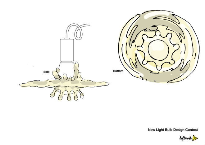 LED電球を水面に落ちた水滴とみたて、その周りに広がるミルククラウンと波紋を表現したカバーです。ふだんは見えないカバーの裏側には水滴(電球)が落下のときに巻き込んだ気泡のような造形があるとより面白いと思います。横から見るとまわりに広がる波紋部分は曲面の凹凸のある円盤状になっています。クラウンの中央はLEDが露出しており、直接LEDの光が降り注ぐ中央部分とカバーにより光に変化のおきる周辺部分と変化を与えられたらと思いました。重力に逆らい天井に水滴が落ちたかのような錯覚が与える、自室など、友人知人を招く空間などにさりげなく設置してあると、気付かれたときに面白いのではないかと、「なにそれ」というような面白さがあるのではないかと思います