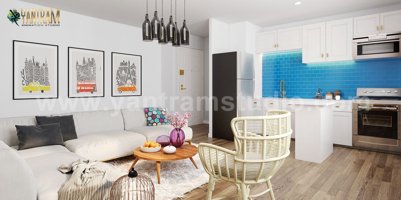 Living Room Kitchen Combo of 3d interior modeling by 3d architectural design