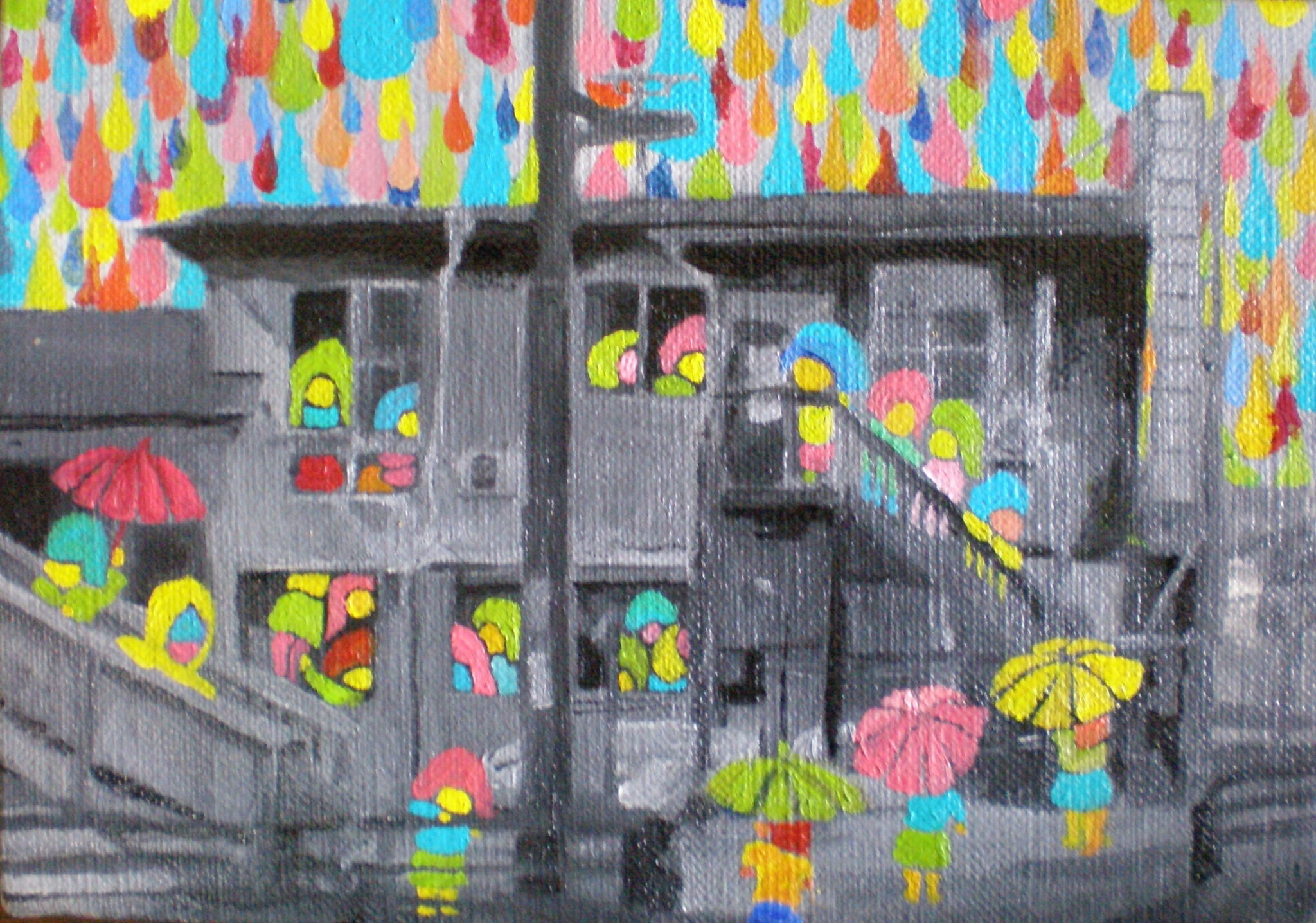 実家に戻り、携帯で撮ったいわきの廃屋をモチーフにしています。雨と子どもの姿を描き加えました。