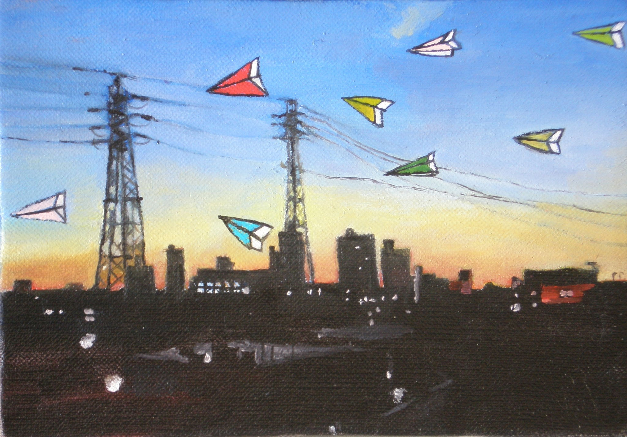 朝焼けの空で、ふらふら飛ぶ紙飛行機です。