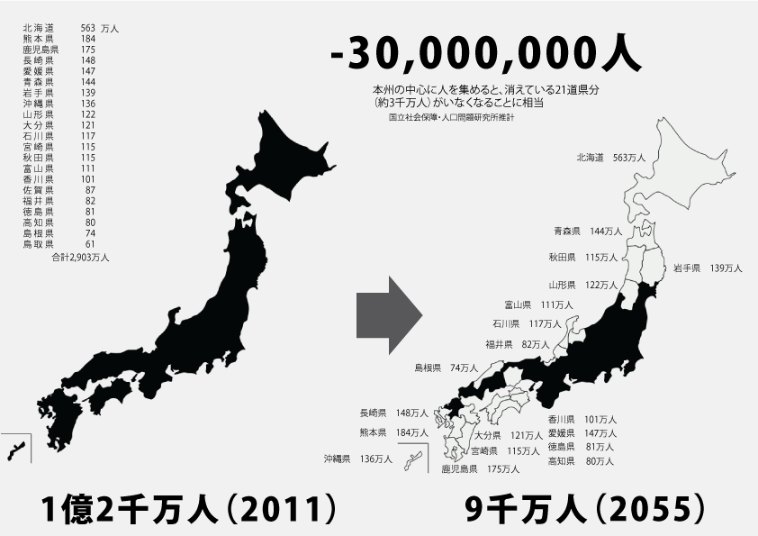 2011年に約1億2千万人の日本の人口が2055年には約9千万人と約3千万人減ってしまいます(国立社会保障・人口問題研究所推計)。この約3,000万人という数字を現在の県別の人口で計算すると、21道県に住む人口に相当します。それを日本の絵として見せると、縮小する日本、が見えてきます(もちろん、この県が過疎化するなどの問題ではなく、たまたま人口として少ない県から減らしていった次第です)。
