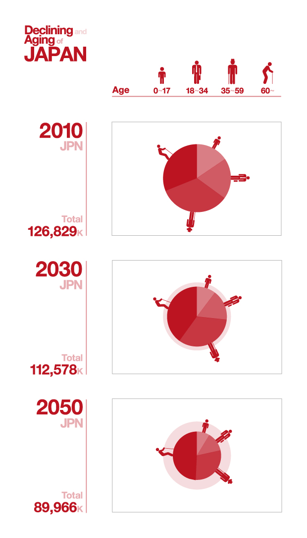 元データを眺めていて驚いた部分「40年後には、60歳以上の人口が全人口のおよそ半分にまで増える!」に焦点を絞り、それが国籍・老若男女問わず一目で伝わるようなインフォグラフィックを目指しました。