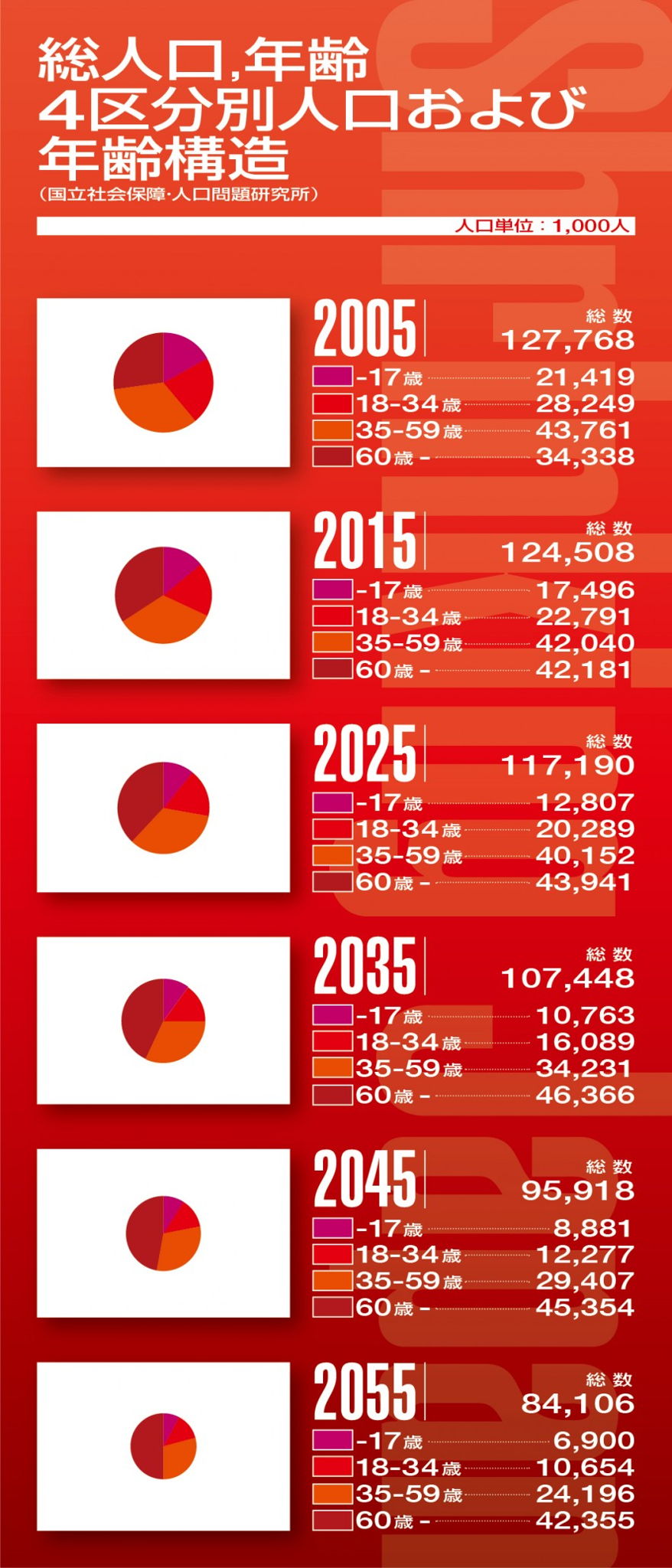 また、同時に「日の丸部分」を年齢区分別人口の円グラフにすることで、人口減少とその年齢構造をひとめでわかるようにしました。