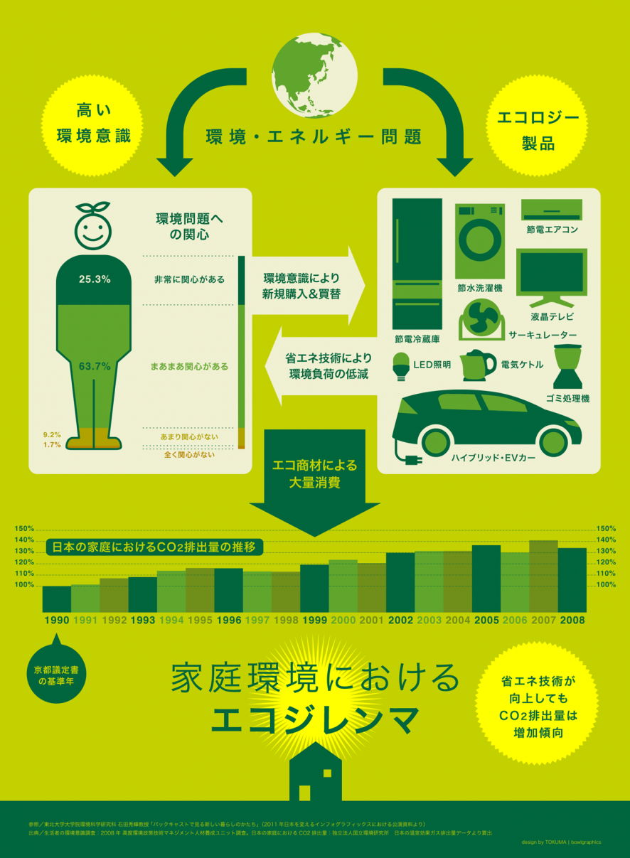 人々の環境問題への関心が高くなると共に、省エネ技術により開発されたエコロジー製品の新規購入や買替などが増え、家庭における環境負荷の低減がなされてきた。しかし、それは同時にエコ商材の大量消費でもある。皮肉にも、京都議定書制定年以降、日本の家庭におけるCO2排出量は年々増加の傾向にある。まさに家庭環境における〈エコジレンマ〉が生じている。