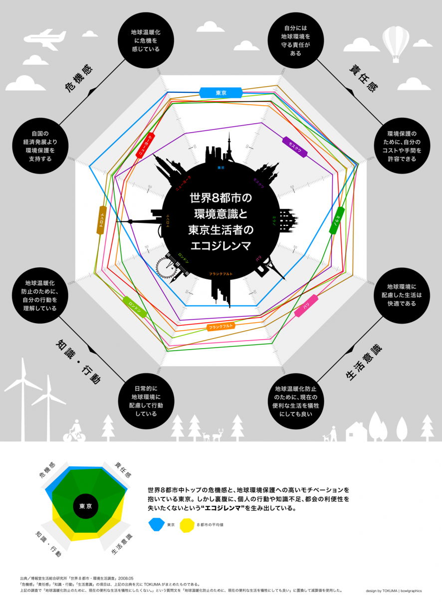上記の調査報告書から8つの質問を抜粋し、それらを「危機感」「責任感」「知識・行動」「生活意識」の項目に振り分けました。そして「世界8都市の環境意識」と、そこから見えてくる「東京生活者のエコジレンマ」をグラフ化しました。