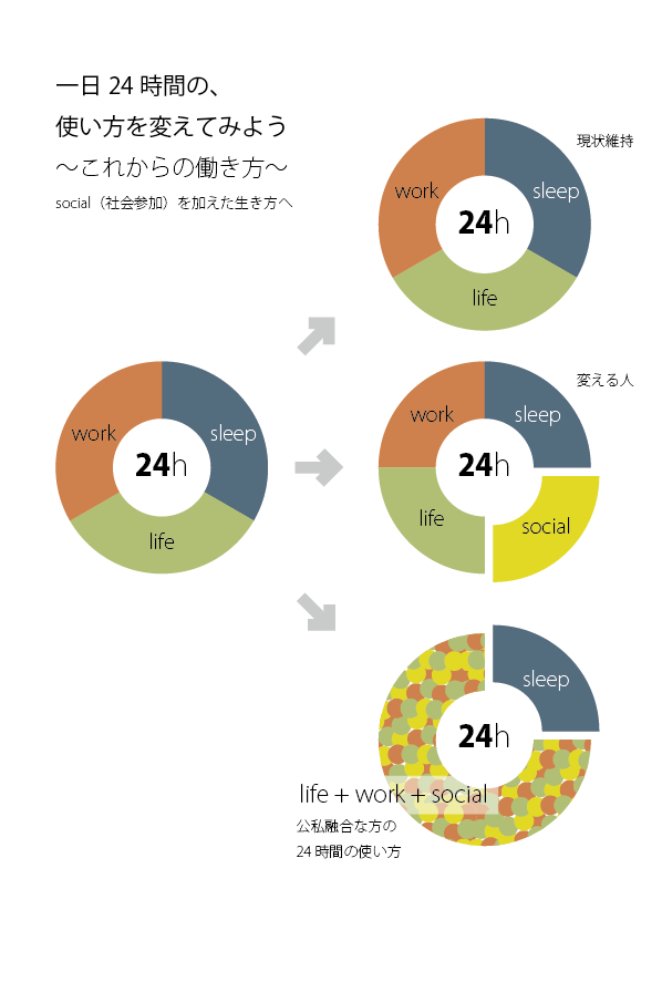 これからの働き方として一個人の24時間の使い方を再考したいと考えています。従来の労働8時間、睡眠8時間、残った時間を自分たちの生活の時間とすると、もう24時間めいっぱいになり、「寝に帰るだけ」の日々が続くことになります。高度経済成長の時代ならまだしも、現在はむしろ24時間を4つに分けて、労働6時間、睡眠6時間、生活6時間、そして社会参加6時間という24時間の使い方を提案したい。少なくとも私たちはそれに基づいて6時間勤務を8年前から実施し、それにより雇用者数を増やすワークシェアリングも実現しています。