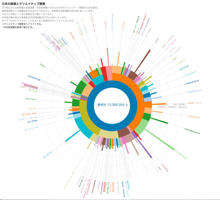 日本国における各産業の従業員数・付加価値額とそれらに対するクリエイティブ産業の占める割合をWeb上で表現しました。