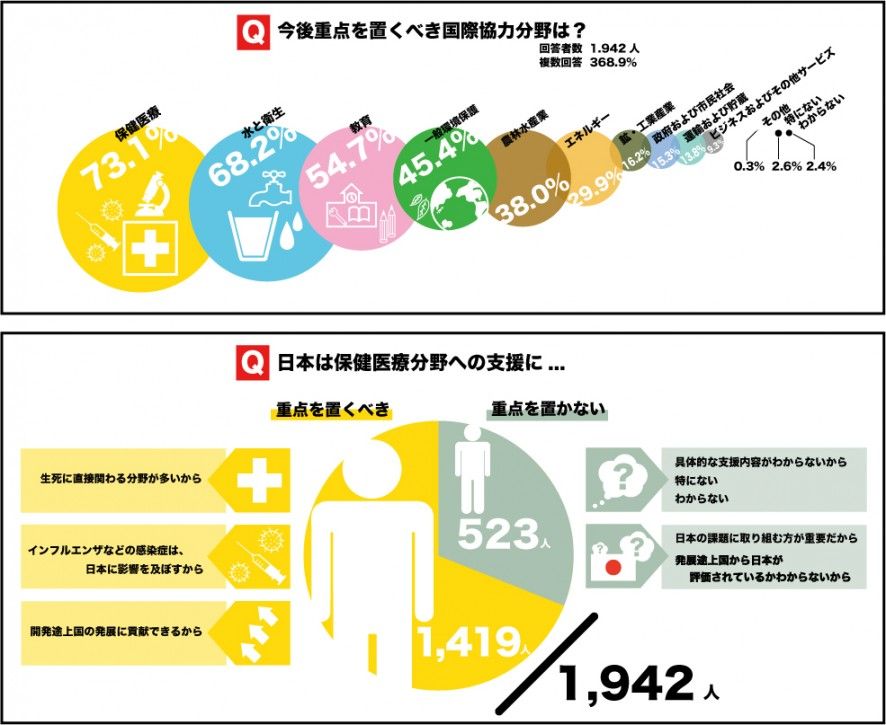 今後の重点を置くべき分野については、保健医療を筆頭に人命に関わる活動分野が目立ちます。