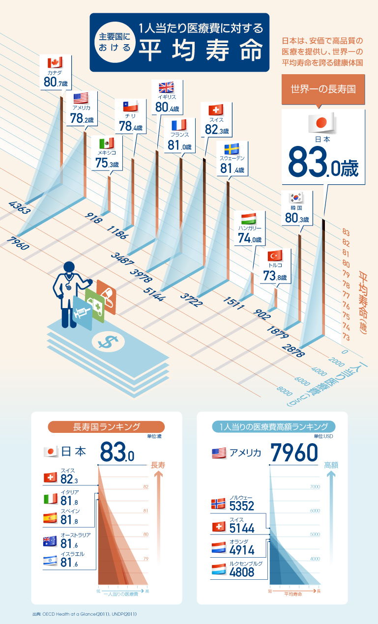 日本は安価で高品質の医療をし、世界一の平均寿命を誇る。それに対して1人あたり医療費を3倍弱多く支払うアメリカは、日本よりも平均寿命が5歳弱低い。