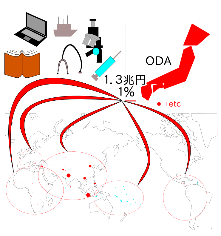 「主要先進国発 発展途上国向け 開発援助全体及び保健分野における資金量(2010年)」の資料より日本から各国分を世界地図にマッピングして日本より医療・研修・情報等が支援されているイメージを描いて見ました。