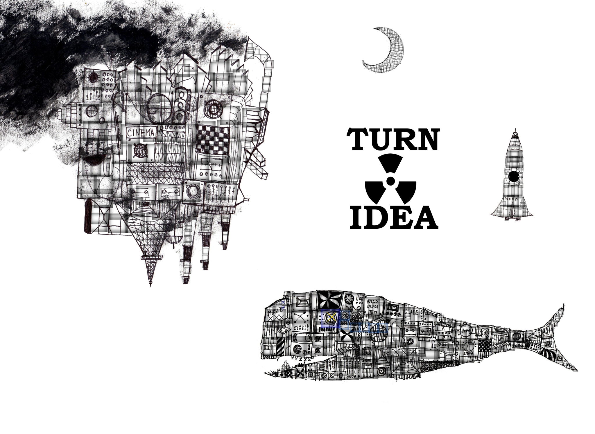 どんなアイディアもゼロから生まれているわけではなく、過去の様々な発想が組み合わさって出来ているというコンセプトで制作しました。つまりどんな発想も歴史の積み重ねの上にあるということです。通常1枚の絵には時間はありません。時間を付与したい場合は巻物にするか物語を与えるしかありません。例えば中央の文字を起点にして時計回りに一つ一つの絵を観る事で物語が生まれます。例えば上部の月の絵から右下のロケットの絵への移行は時間=物語を観る人に要求します。つまり絵の観賞方法の提案をしたいという意図で制作しました。