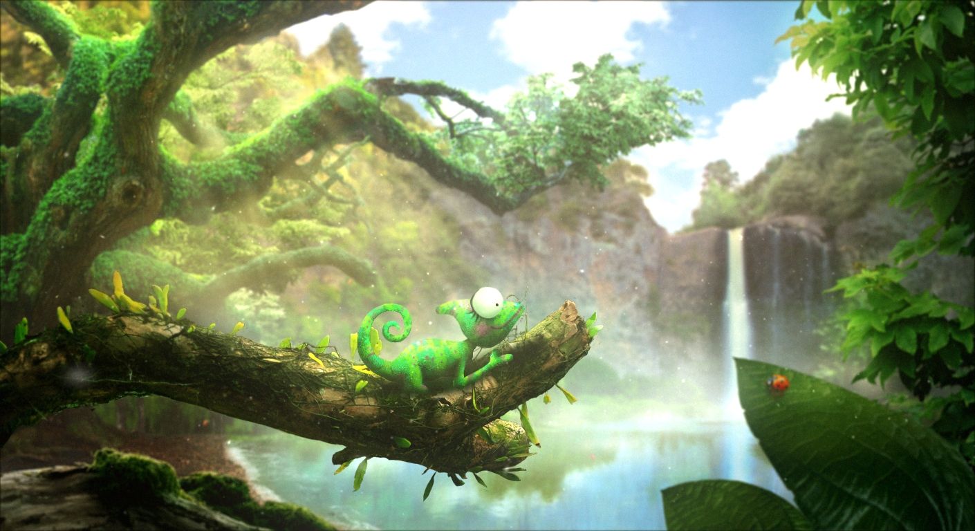 A matte painting for my final year project. A female chameleon resting on a tree trunk in a beautiful forest.
