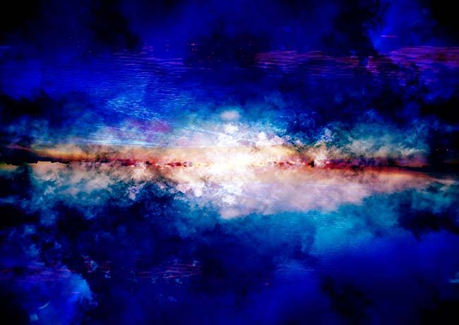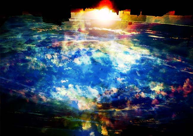 朝焼けと昼間の空、夜の街並みの写真を加工、合成した作品。星はいつだって私たちの頭上にある。朝も昼も夜も、たとえ星が見えなくてもそのことを忘れず上を見上げてほしい。