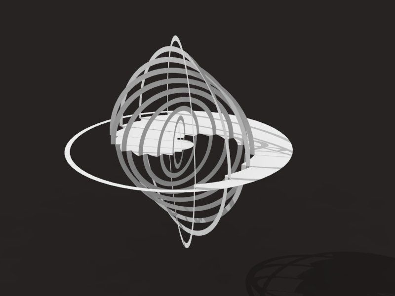 半円形のカットが2本ずつ、少しずつ角度を変えて連なってるので、真ん中から順番に折り曲げていくと、天球儀のような、立体的な同心円の連なりが姿を表します。