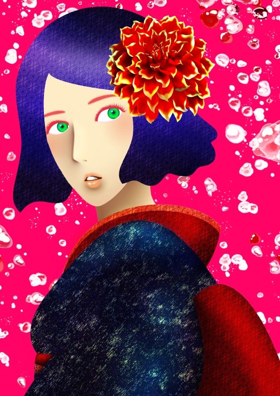 女性の髪飾りはダリアの花です。ダリアの花ことばのような優雅な女性になるように心がけました。ふと目があった瞬間を描きたかったので、この絵を見た人がこの女性と目があったように感じるように瞳の色を和の雰囲気を壊さない程度に鮮やかにしました。また、髪の毛をレース柄にすることで可愛らしさを表現しました。配色においてはお淑やかな和風というよりもビビッドでオシャレな和になるように描いています。