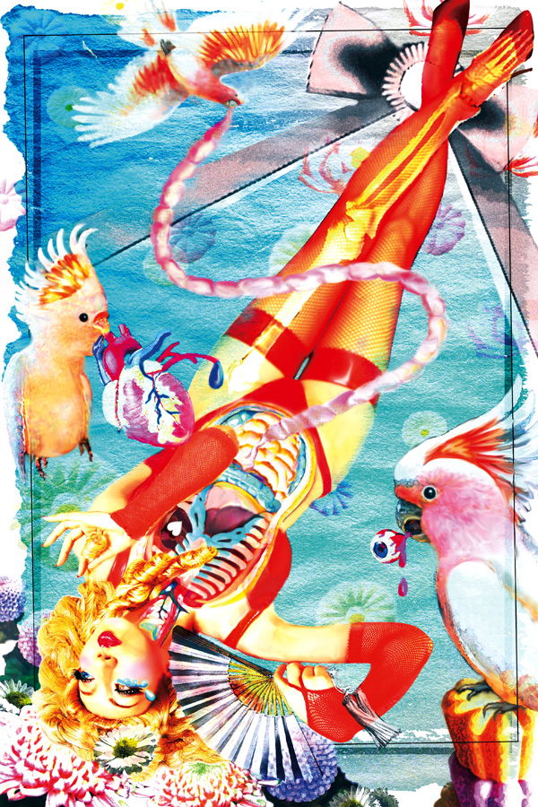 人物は自身の画像を基にしています。グロくなり過ぎないよう鳥は可愛いオウムに、人体はかなりイラスト的に加工してポップな印象にしました。