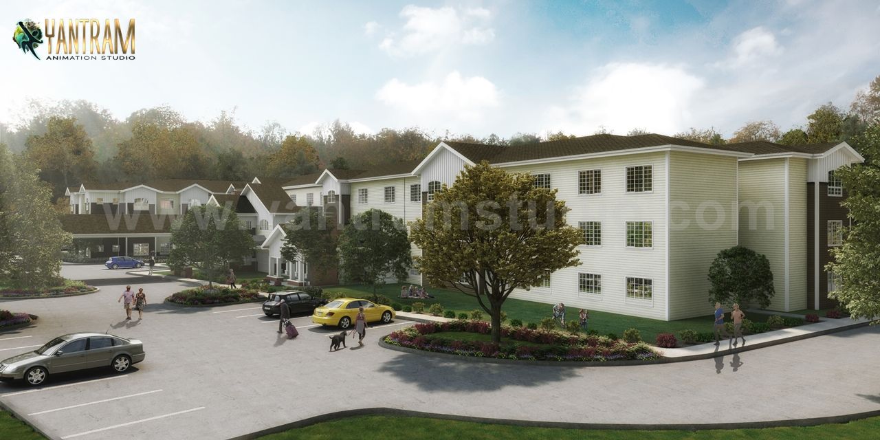 アクティブアダルトエクステリアレンダリングサービスコミュニティはマスタープランのコミュニティに位置しており、様々なリゾートスタイルのアメニティやアクティビティを提供しています。 敷地内には、3D Exterior Designersのある居心地の良いリビングスペースや造園エリアの娯楽に最適な様々なオープンフロアプランのライフスタイル、居間、駐車場、ランニングウェイ、木、高齢者、Architectural Modeling Firmによるエクステリアハウス