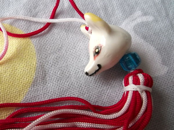 ちょっといたずらっぽく微笑む、白狐のこども。繊細な作りなので、帯飾りなどにお使いください。